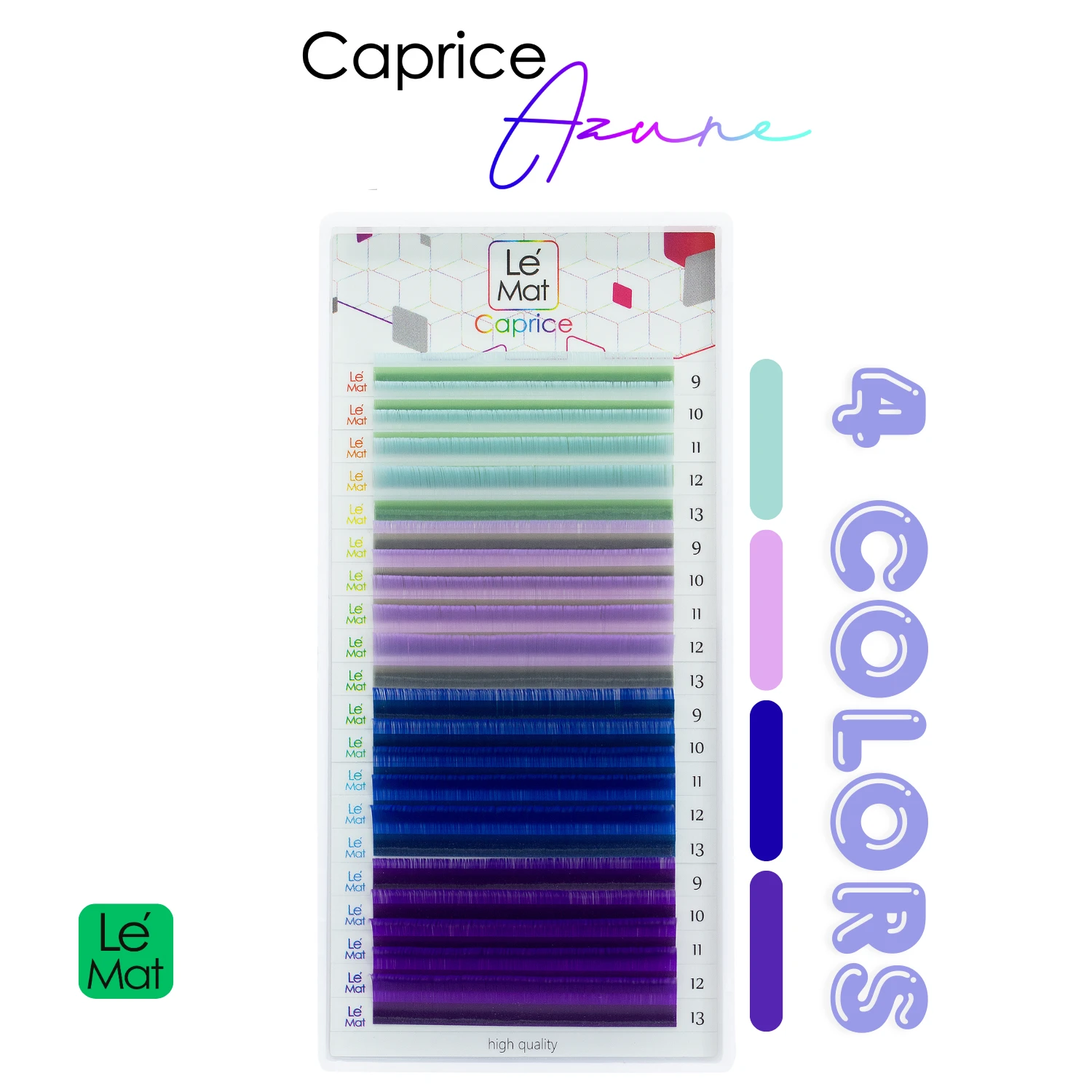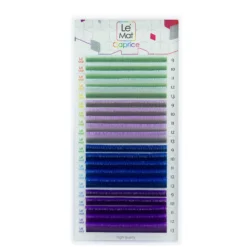 Introducing the Le Mat Caprice – Azure colored eyelash extension tray, designed for lash artists who want to add creativity and dimension to their work. This tray includes four carefully selected colors, each available in lengths 9, 10, 11, 12, and 13 mm. The shades range from light green to cool blue, violet, and deep purple tones, offering a versatile palette for both subtle and bold lash designs.